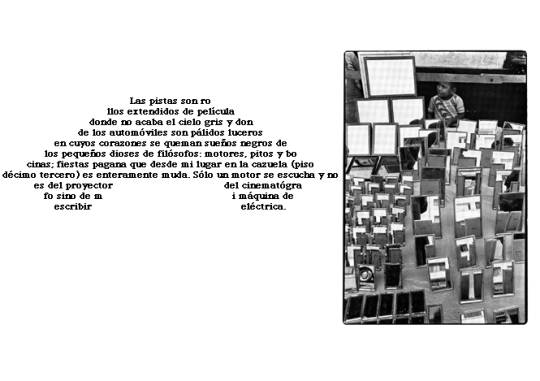 En el caso de Fernando Castro, tenemos que el poema viene acompañado de una imagen fotográfica; su texto escrito se orienta según el procedimiento de Oquendo e incluso lo extrema haciendo que las palabras, en su ordenamiento sobre la página, configuren una imagen: es escritura que se quiere visual, pero que sigue siendo escritura. La relación inmediata del texto escrito con la imagen fotográfica lo saca, sin embargo, de su código letrado visual e intenta llevarlo al de la fotografía poniéndolo en una situación ambigua de tener que dialogar con un medio y un lenguaje que no es el suyo. El texto se define todavía por su código escritural, pero la fotografía enfrenta al lector con la lectura que le es propia y que presupone otra noción de espacio y tiempo y otros hábitos hermenéuticos. La consideración de un ejemplo puede mostrar de qué se trata en este caso. En el que sigue tenemos, a primera vista, un texto construido visualmente de tal manera que da la imagen de un automóvil. Si lo leemos, hay que constatar que se ponen en contacto varios niveles de realidad en una relación de equivalencia metafórica. La vista de las pistas y los automóviles son en primer lugar eso, objeto del espectáculo ciudadano visto desde un décimo tercer piso de un edificio, desde el que no se puede escuchar ni el sonido de los motores ni los pitos ni las bocinas, presentados como una fiesta pagana de lo urbano, ya que está cerrada la ventana. El mundo del sonido está clausurado. Pero resulta que, en una segunda instancia, los objetos ciudadanos vistos son parte de unos rollos de película de un cinematógrafo y que el yo poético se encuentra en una cazuela observando este espectáculo. Esta segunda perspectiva es, sin embargo, pronto desmentida y con ello el dominio de lo tecno-visual: no está en el elevando piso de un edificio, a modo de cazuela, mirando por la ventana (sí lo está, en realidad) lo que sucede en ese rollo de película que puede ser la realidad ciudadana. Aquí el yo poético introduce una tercera instancia: el único sonido que se escucha no es, pues, ni el de un motor de auto ni el de un motor de cinematógrafo rodando con la imagen del automóvil; el sonido que se percibe es el de la máquina eléctrica de escribir por la que el yo poético discurre escribiendo el texto que leemos que, en su forma gráfica construida, semeja un automóvil. Suprimido el ámbito de lo auditivo; suprimido el ámbito de lo visual, se introduce el dominio de la escritura, sólo que este dominio está contaminado por los otros dominios. El poema es la imagen de un auto que se escribe en la máquina escuchando su tactac eléctrico.