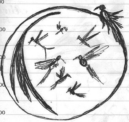 El pequeño helicóptero panea hacia una hortensia y al tiempo va hacia un geranio. Sus alas ensambladas por un dios ebrio demoran la luz en su diminuto cuerpo de fauno redentor, mas hay algo que con ímpetu rechaza. Sediento atraviesa hortensias y amapolas asoleadas, mientras anochece en su solitaria memoria de viajero sin reposo.