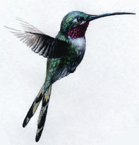 El colibrí ha visto por la mañana moverse extraños nubarrones, zaping del cielo sobrevuela con su pico flamígero, no sabe otra cosa que hacer mientras gotea el día; con su alas verdeazuladas y su cola gótica dibuja en el aire un manojo de presentimientos. Cuando cese la lluvia mermará la mañana -piensa en la distancia que le espera-, mas ninguna tormenta podrá opacar mi polen.