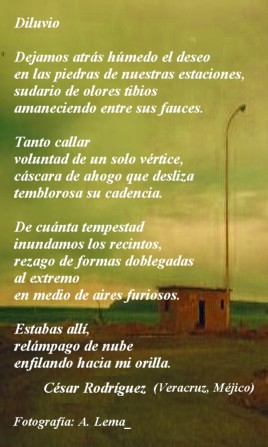 Diluvio ©, César Rodríguez: (Veracruz, México). Poeta. Realizó estudios de ingeniería en sistemas y Maestría en negocios. Editó Ultimo Turno (Tintanueva Ediciones, 2000); El huracán nos pasa (colección La Hoja Murmurante, Editorial La Tinta del Alcatraz, 2000) y En la Campiña, (Tintanueva Ediciones, 2000)
