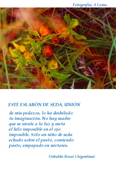 Este eslabón de seda, unión © Osbaldo Bossi (Argentina). Poeta y narrador. En el año 1997 publicó Tres (Editorial Bajo la Luna de Rosario) y en el 2001 Fiel a una Sombra (Editorial Siesta) (malmstad2001@yahoo.com.ar)
