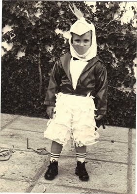 Y una fotografía en la que participo en un drama de Purim. En el escenario hay un total de nueve compañeros de clase. La festividad judía de Purim se relaciona con la esclavitud de los judíos persas que vivían en Shushan, entre los años 486 y 465 a.C., bajo el rey Asuero, hasta que la joven princesa Ester, guiada por su tío Mordecai, los liberó. Soy el tercero, desde la izquierda. Mi mirada parece fijada en el público. Todos los niños vestimos sombreros y chalecos estilo carioca, y –todos excepto uno– calzamos zapatillas blancas. Algunos tenemos maracas en la mano y otros, triángulos.