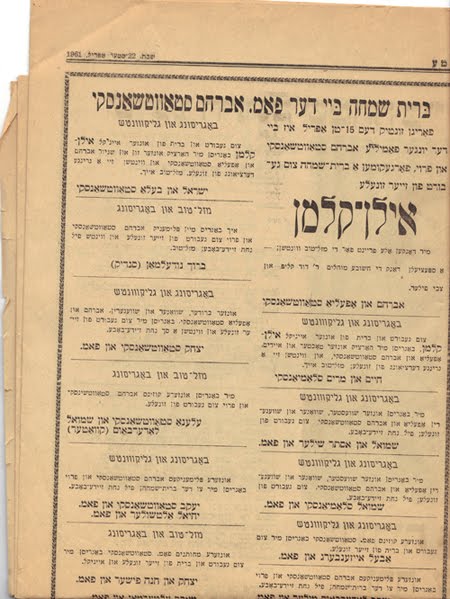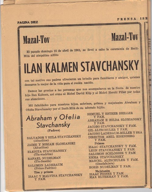 Y una foto mía como mago. Me gusta mucho. También me manda los anuncios en idisch y en español de mi Bar Mitzvah, celebrado el 20 de abril de 1974, en el templo Bet-El, de la calle Horacio, número 1722, Colonia Polanco (México D.F.). (Mi nombre: Ilan Kalman Stavchansky.)