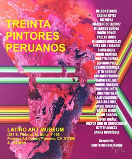 El día 4 de noviembre y hasta el 25 de noviembre de 2017, en el Latino Art Museum de California ( 281 S. Thomas St. Suite: # 105 Pomona Art Colony, Pomona, CA) permanece la muestra: “TREINTA PINTORES PERUANOS” Conformada por treinta pinturas de los artistas peruanos: Angélica Flores / Nelson Flores / Sabina Reyes / Luz Viera / Marlene De La Cruz / Milagros Zuñiga / Rocío Ponce / Paola Flores / Mialgros Gonzales / Pietá Bieli-Bianchi / Silvia Mejía / Jorge Ramírez / Ernesto Guerra / Giuliana Pita / Cosmos Hermoza / Tito Bobbio / Gustavo Piscoya / David Brillas / Manuel Vasquez / Mathieu L’Hôte / Luis Portilla / Lalo Velásquez / Carlos Lenes / David Soriano / Edison Mejía / Edson Chacón / Judith Ibañez / Víctor Ruiz de Somocurcio / Lizette Acosta / Daniel Rodríguez