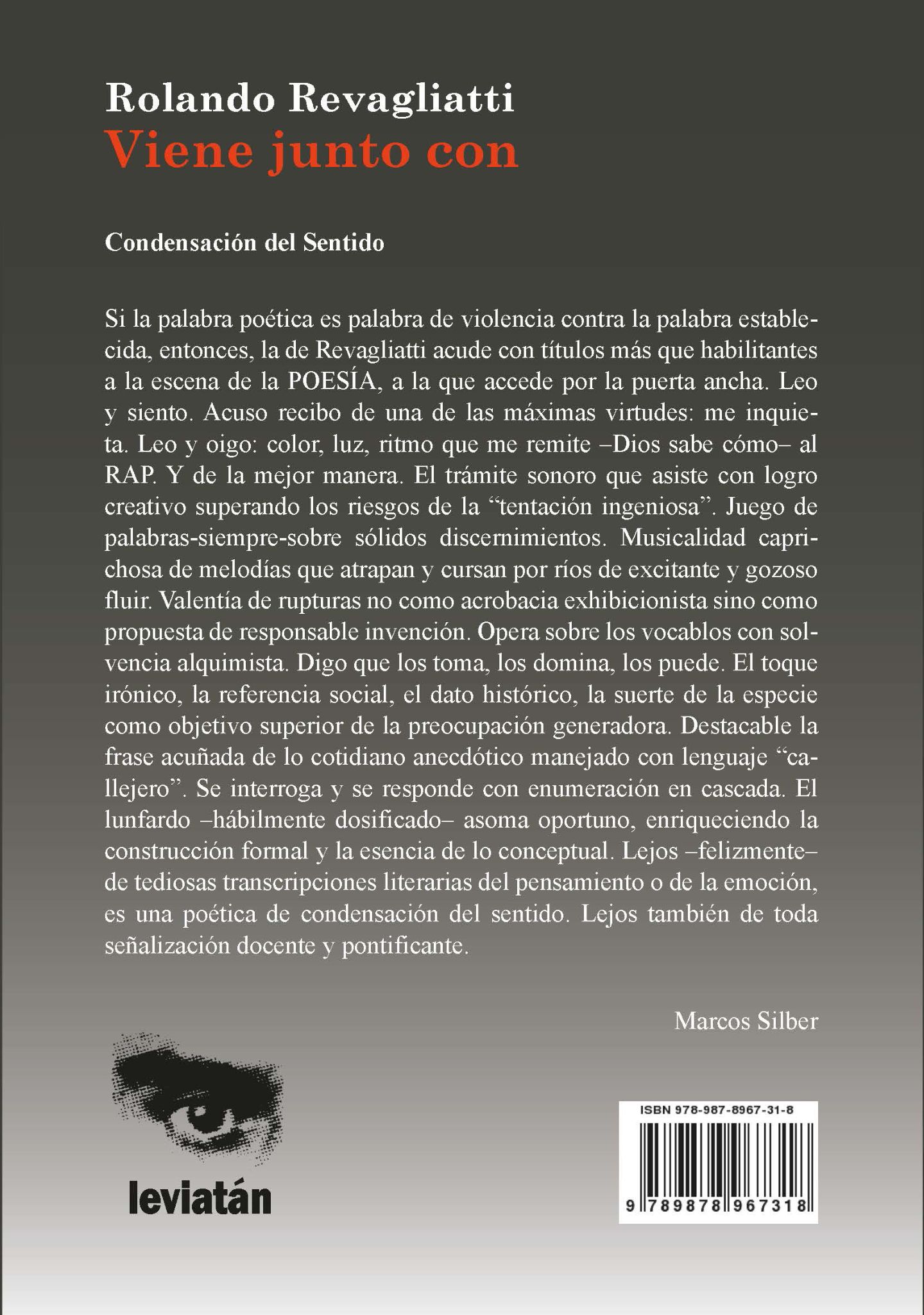 1. Los poemas que integran Viene junto con son perfectos ejemplos de una original, trabajada y discernible manera de hacer poesía; la misma que, en mayor o menor medida, podemos encontrar en casi todos los libros de Rolando Revagliatti; la misma que, sin temor a exagerar, podemos entender como una estética, como un estilo. Tal como plantea Marcos Silber en el epílogo, advertimos en estos textos la preeminencia de «una poética de condensación del sentido», pero que no se manifiesta tanto en el plano conceptual (al menos, no de la forma en que la hallaríamos en Bashō, Gracián o Girri), sino más bien en el plano sintáctico, en donde la ruptura sintagmática, la elisión y el anacoluto, junto con los singulares juegos de palabras, se ponen sus mejores ropajes de operadores discursivos de poetización para trastocar la matriz lógica de los enunciados escogidos. Un ejemplo de esto bien podrían ser los versos del poema «Asumiendo»: «Uno / ya / se va / perdiendo // Cosas / uno / ya / se va // Perdiendo / de ellas // Perdiéndoselas».